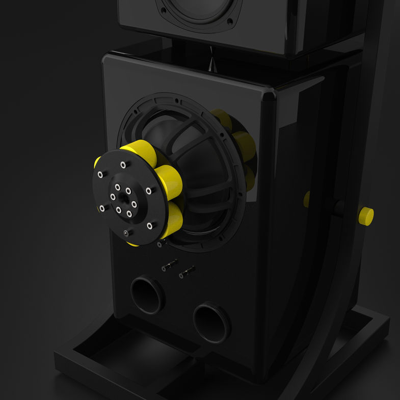 Each side features a hand-crafted 12-inch custom subwoofer with a ring-array magnet structure, uniting powerful low-frequency performance with a bold, sculptural design that defines our unique audio aesthetic.